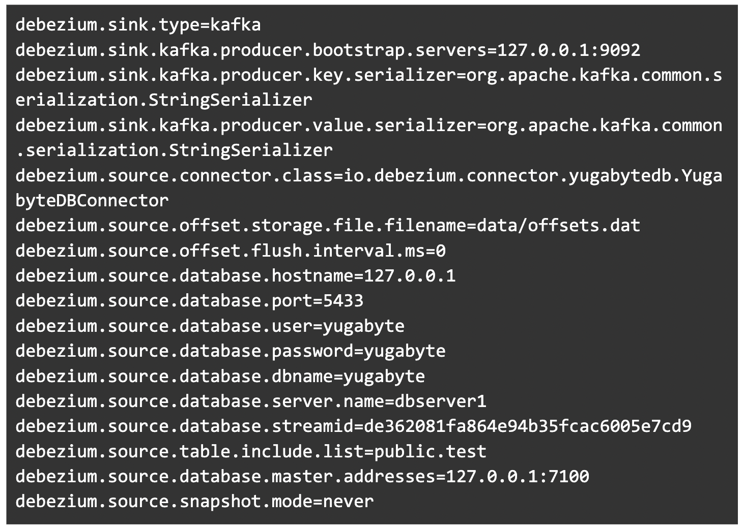 Before starting the debezium-server, we need to provide some configurations so that the connector can start pulling changes from YugabyteDB.