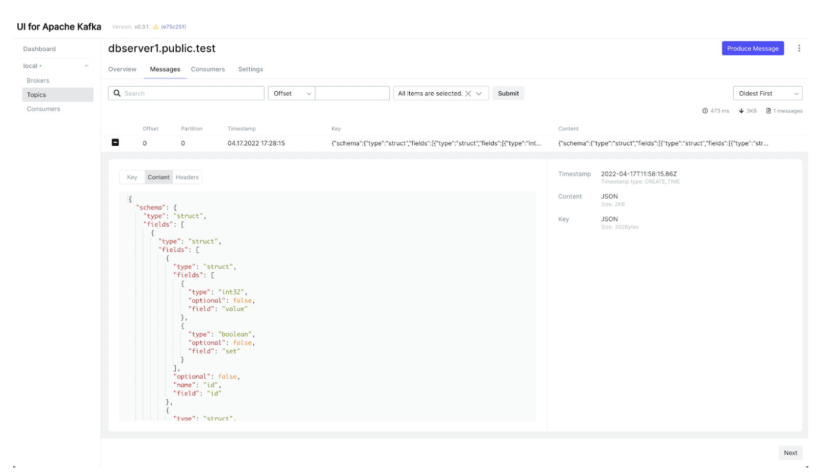 As soon as you insert data, you’ll see a message getting populated in the Kafka topic in the UI as shown in the below image:
