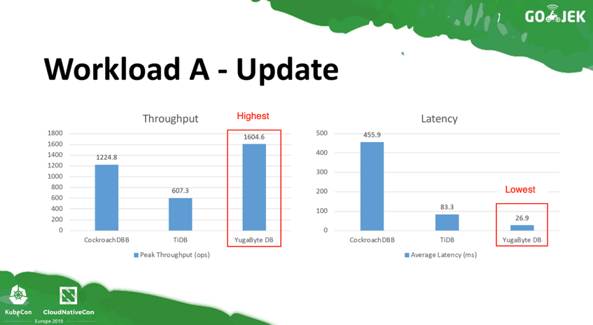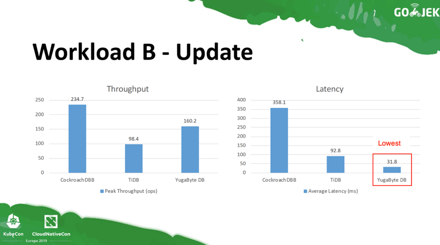 Iqbal Farabi and Tara Baskara, Systems Engineers from GO-JEK Indonesia, recently presented the results of their benchmarking of cloud native databases on Kubernetes at KubeCon Europe in Barcelona. The three databases they benchmarked were CockroachDB, TiDB and YugabyteDB. This post brings their presentation (video recording) and slides (PDF) to the attention of our readers. It also highlights a few areas of collaboration between the GO-JEK team and YugabyteDB Engineering.