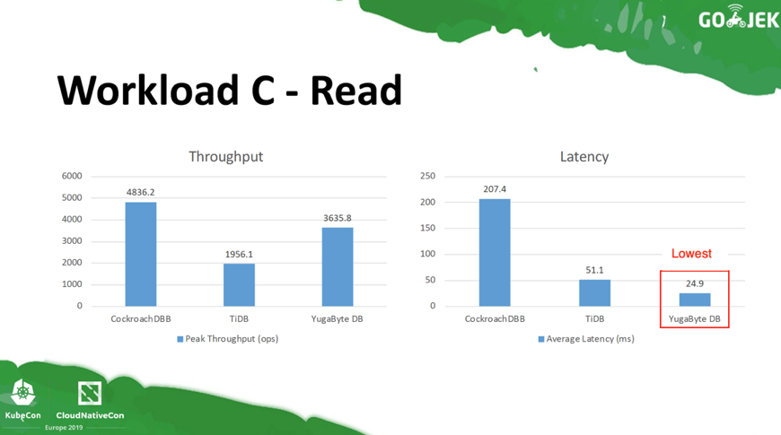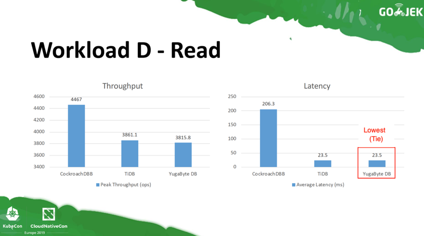 During their presentation, the GO-JEK team noted that they were not able to run Workload E (focused on Short Range Scans) on YugabyteDB. Needless to say, it was disappointing for us to hear. We would love to work with the GO-JEK team to fix the issue and have results published even for this workload. That would also give us an opportunity to understand why throughput is lower than our expectations for workload B-D.