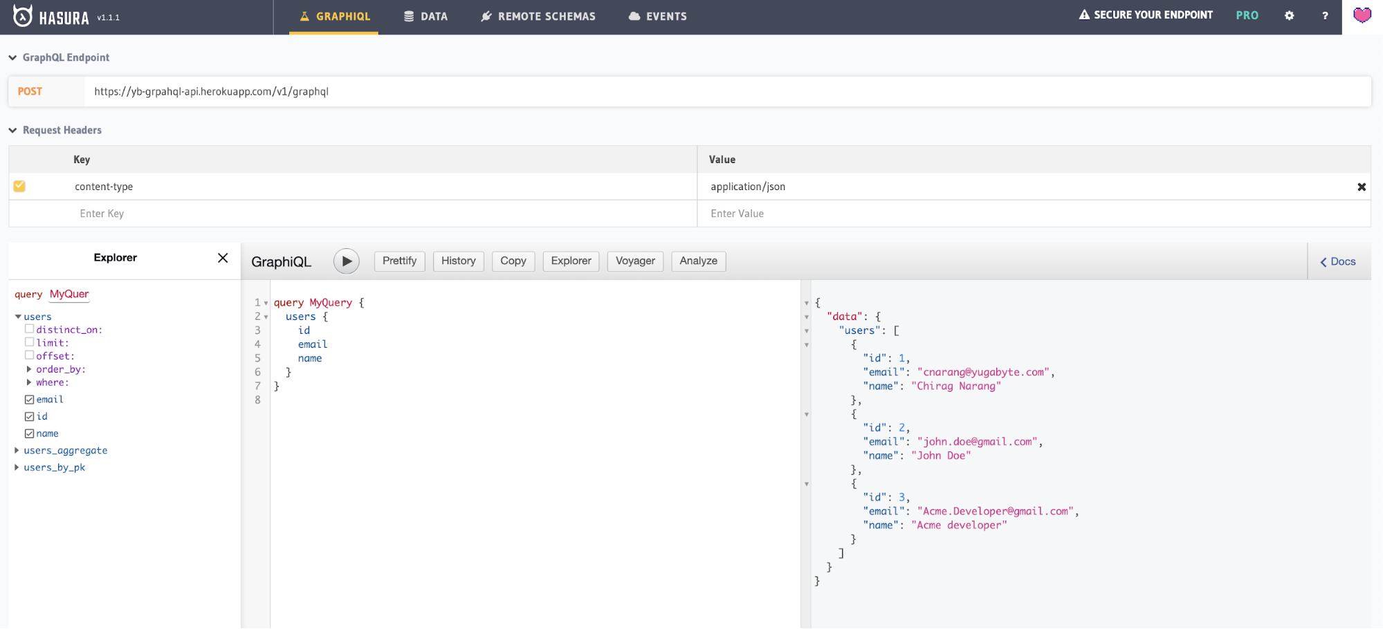 yugabyte=# SELECT * FROM users; id | name | email ----+----------------+-------------------------- 1 | Chirag Narang | cnarang@yugabyte.com 2 | John Doe | john.doe@gmail.com 3 | Acme developer | Acme.Developer@gmail.com (3 rows)