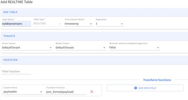 Figure 8: Schema of Outdoorsensors In case of real-time tables in Apache Pinot make sure the “pinot.server.instance.reload.consumingSegment” config is set to true inside Server config. Without this, the current consuming segment(s) will not reflect the default null value for newly added columns. Note: the real values for the newly added columns won’t be reflected within the current consuming segment(s). The next consuming segment(s) will start consuming the real values.
