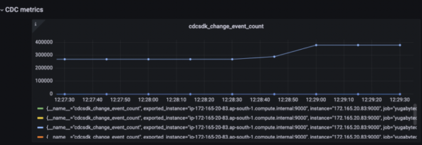 Change Event Count: The Change Event Count metric shown in Figure 4 displays the number of records sent by the CDC Service from YugabyteDB.