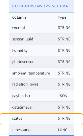 Figure 8 below shows the Schema of Outdoorsensors Realtime table in Pinot. (Note that a new column, status, was added).