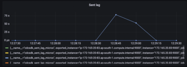 Figure 4: Change Event Count Sent Lag: It keeps track of the difference between the commit time of the last streamed record to the connector vs the newest committed record to YugabyteDB. This metric is maintained on a per-node level. We tested this integration in a single node. Figure 5 shows Sent Lag with the different timeframes.