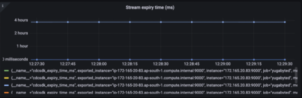 Figure 5: Sent Lag Stream Expiry Time: Records are retained in WAL for a limited period of time. The retention period can be configured using cdc_retention_time_ms. Figure 6 shows stream expiry time in milliseconds with the different timeframes.