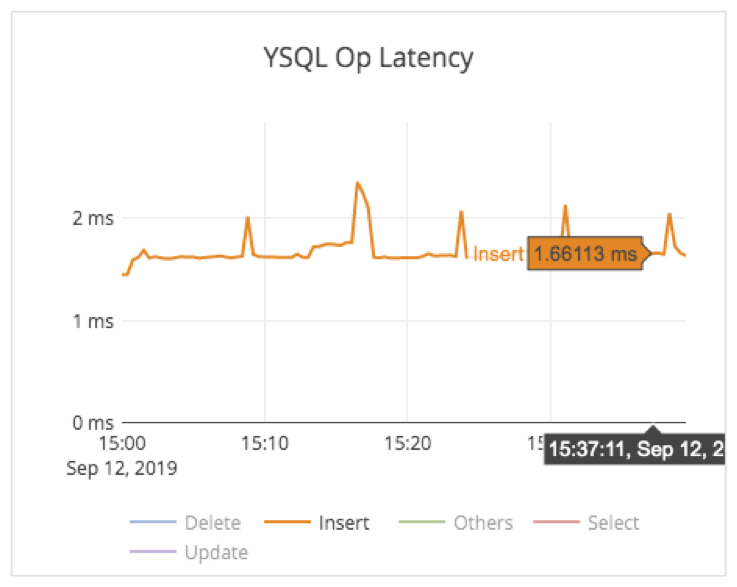 The corresponding average insert latency across all the 100 nodes was 1.66ms, as shown below. Note that each insert is replicated three-ways to make the cluster fault tolerant.