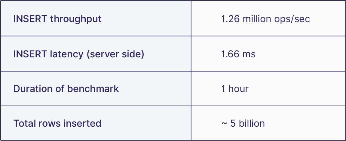 - There are 2400 concurrent clients performing inserts. Each benchmark program uses 400 write threads, and there are six such programs running concurrently.