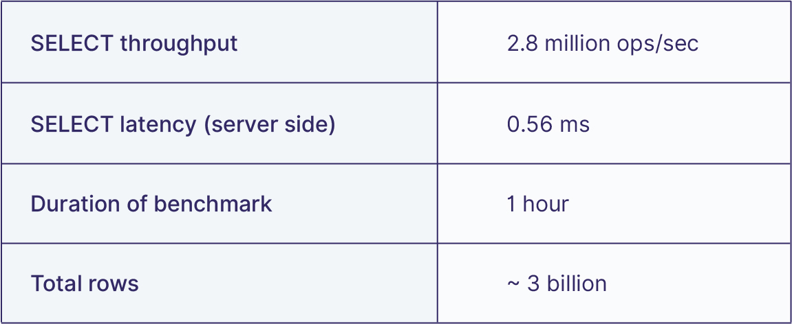 - Each read operation randomly selects one row from a total of 3 billion rows. Each benchmark program randomly queries one row from a total of 500 million rows, and there are six concurrent programs.