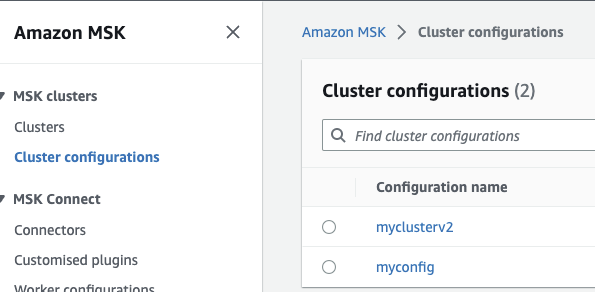 In AWS MSK, under MSK Clusters menu (on the left side) will show cluster configuration. Click to create a new configuration and enter the values below on the configuration settings. Then save it.