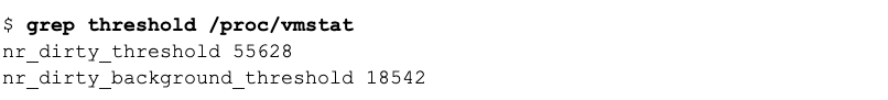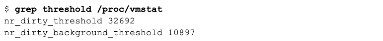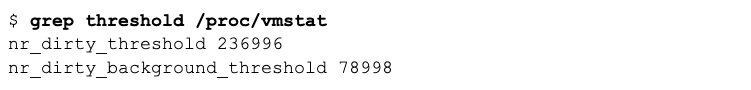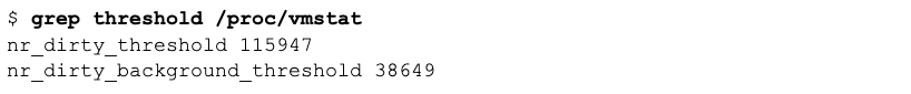 The /proc filesystem also contains the current thresholds. Because this all is fully dynamic, these values will deviate a bit, but it’s clear these are very close; the dirty threshold is 236996 (pages 4K) = 926M, and the dirty background threshold is 78998 (pages 4K) = 306M.