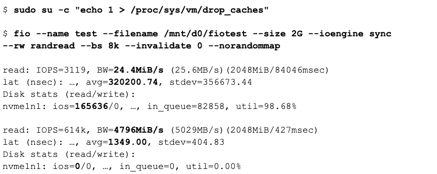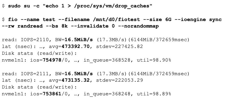 Take a closer look at the following fio run. We changed the –rw switch to “read”, which means the file is sequentially scanned. As a result, it only scans every page in the 2G file once, so it cannot take advantage of caching: