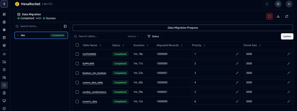 HexaRocket enables seamless schema and data migration from Sybase ASE to YugabyteDB through a simplified one-click execution model. It eliminates manual effort by automating the entire migration lifecycle, from schema and data extraction to loading into the target database. By leveraging high-speed parallel processing, HexaRocket migrates multiple objects simultaneously, significantly reducing downtime and improving performance during large-scale data movement.