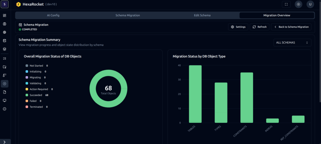 As shown in the “Migration Overview” dashboard in HexaRocket, all 68 objects were migrated successfully.