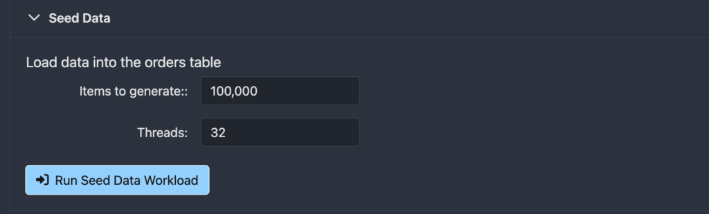 App UI for RetryExample workload simulation. Using the UI, we will trigger the simulation. Click on the “top left hand” hamburger menu to bring up the app options. Choose “Usable Operations” and then select “Create Tables.” Clicking the “Run Create Tables Workload” will create two tables — “products” and “orders” — in the Yugabyte database. We will use these tables to run our simulations.