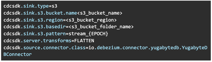 For starters, configure the CDCSDK server to work with the S3 sink. Below is a sample configuration:
