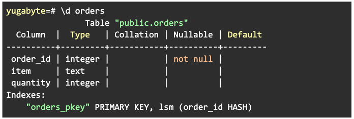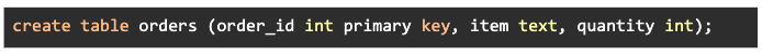We’ll push the CDC events for the below table “orders”. That means we’ll use the command having three columns: “order_id”, “item”, and “quantity” to create the table.