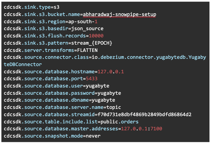 Below is the CDCSK server we used. Please note we will stream the records to the S3 location (s3://abharadwaj-snowpipe-setup/json_source/). We have also configured the CDCSK server to create and push one file to S3 per 10,000 records (cdcsdk.sink.s3.flush.records).