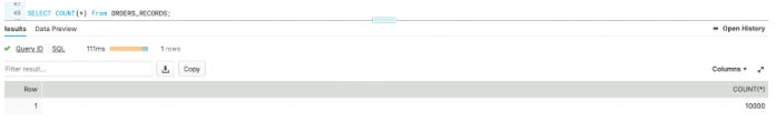 In this example, we have configured a table called: “ORDERS_RECORDS” in Snowflake. Upon querying the table, we see there are indeed 10,000 records: