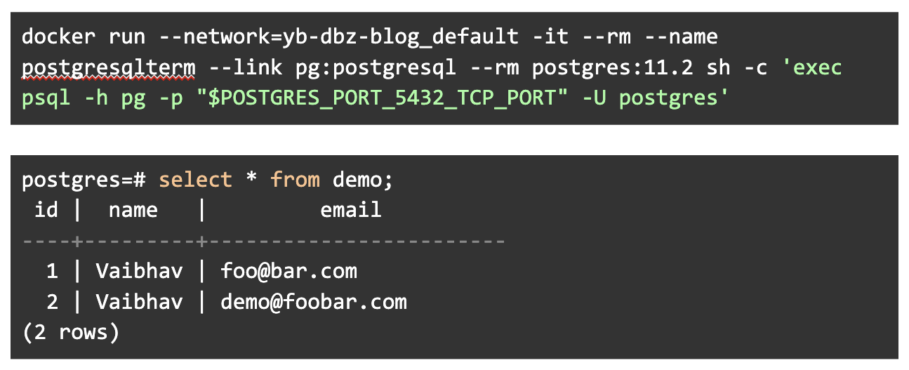 docker run --network=yb-dbz-blog_default -it --rm --name postgresqlterm --link pg:postgresql --rm postgres:11.2 sh -c 'exec psql -h pg -p "$POSTGRES_PORT_5432_TCP_PORT" -U postgres'