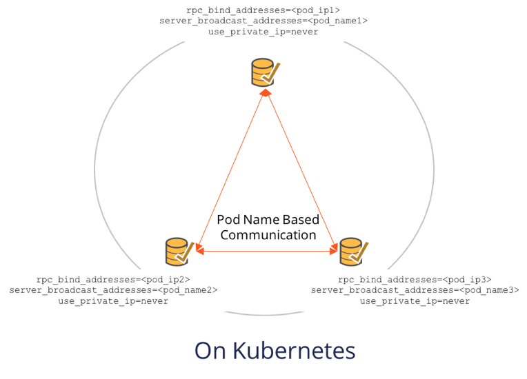 - In Kubernetes environments, the pod name is stable when using StatefulSets. However, upon a pod death and restart, the pod’s IP address may change, requiring all inter-pod communication to be resolved by the DNS hostname.
