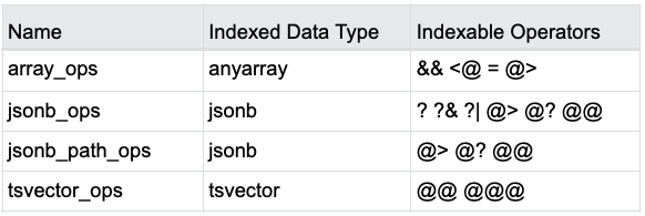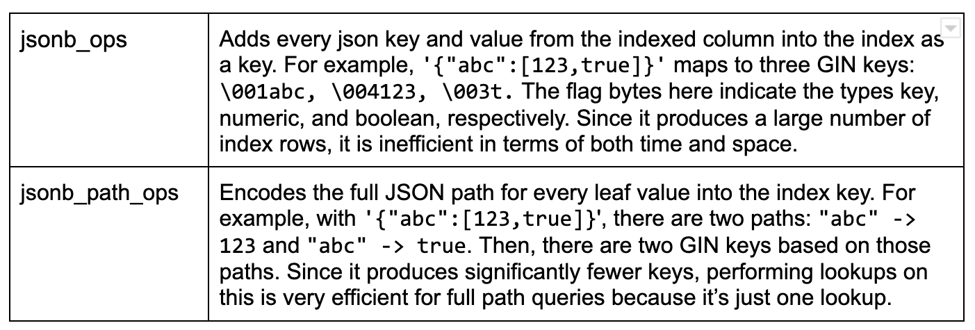 Of the two operator classes for type jsonb, jsonb_ops is the default in PostgreSQL. However, first implement the jsonb_path_ops index due to the reasons highlighted in the table below.
