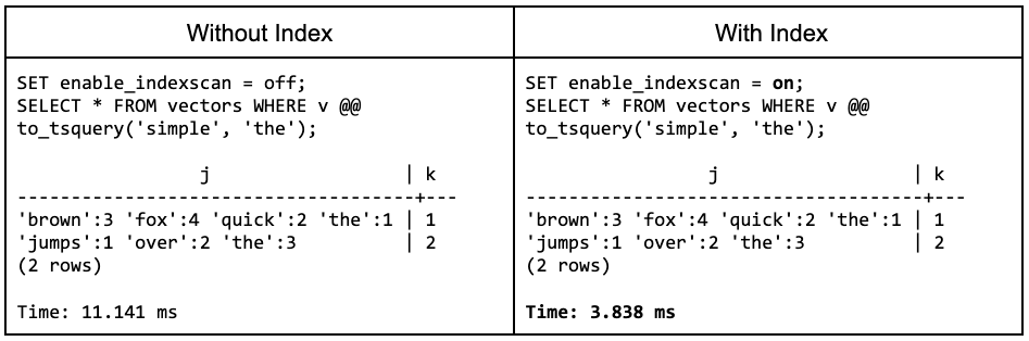 That’s more than a 3x performance improvement when using a GIN index. GIN indexes store mappings from values within a container column to the row that holds that value. This helps speed up these types of searches or queries.