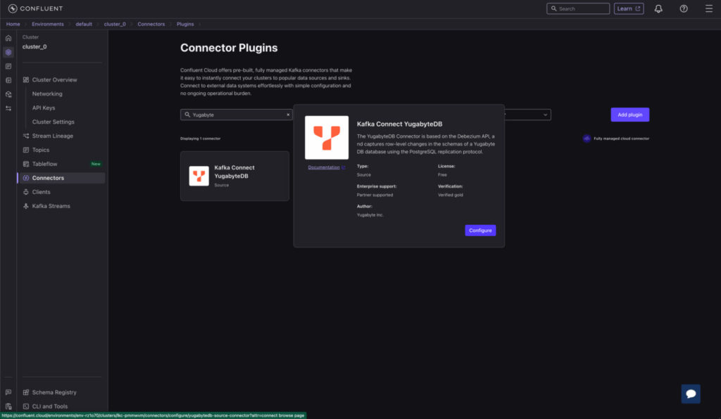 Locate the Kafka Connect YugabyteDB source connector under “connector plugins” and click “Configure” to proceed.