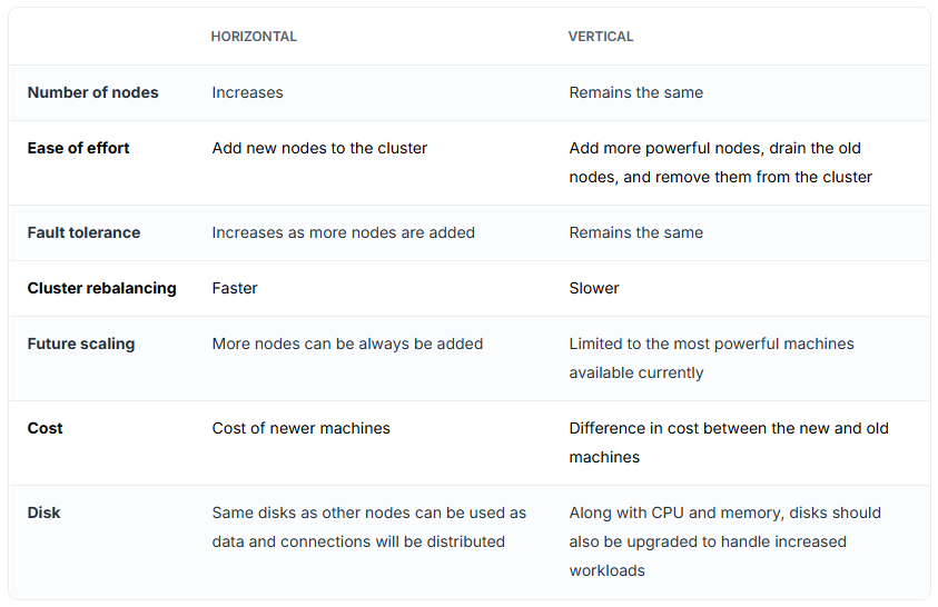 - Downtime: Vertical scaling is often limited by the capacity of a single server, resulting in service interruptions, which can impact application availability. Horizontal scaling involves adding multiple servers or nodes to distribute the load, enabling you to scale without downtime and enhance system resilience and availability.